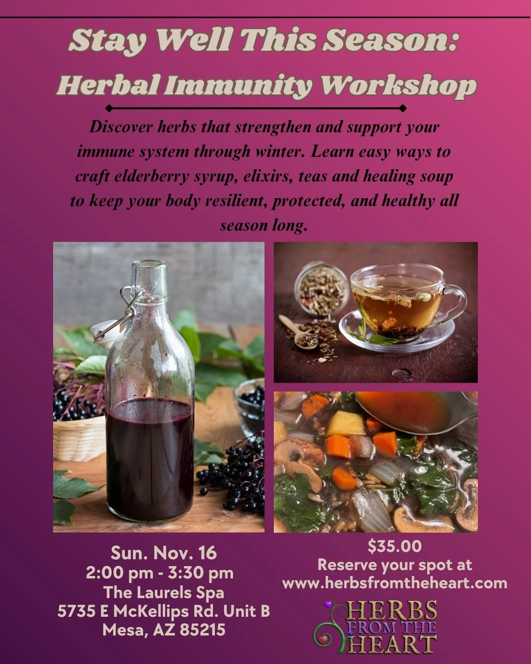 Cold and Flu Season is just around the corner! Join Andrea and friends of Herbs from the Heart for a workshop on how to support your immune system through the winter.