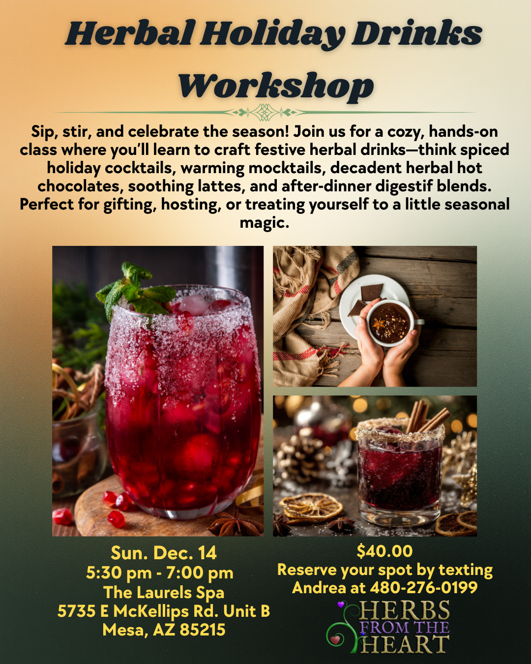 Learn how to make the season’s most festive, herbal beverages. Holiday Cocktails, warming mocktails and delicious hot herbal drinks, oh my! Sip, stir, and celebrate the season with your friends at Herbs from the Heart.